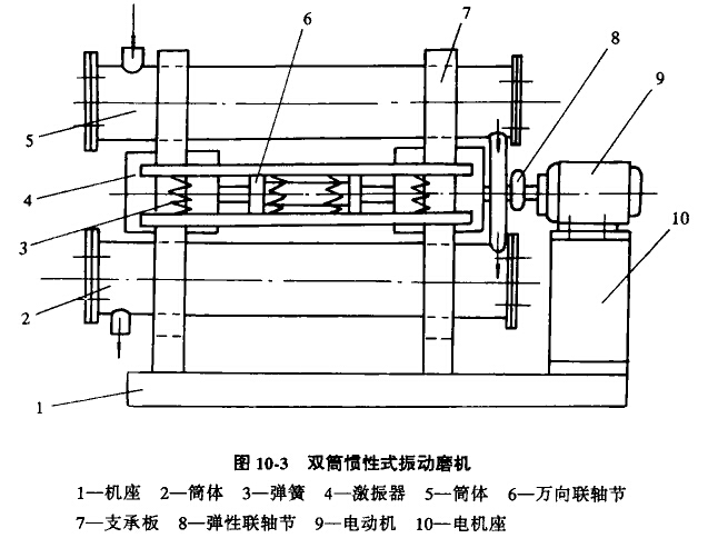 雙筒慣性式振動磨機的構(gòu)造如圖10-3所示。它由機座1,筒體2,5,彈簧3,激振器4,萬向聯(lián)軸節(jié)6,支承板7,彈性聯(lián)軸節(jié)8和電動機9等組成。雙筒振動磨機的粉磨筒體為串聯(lián)方式上下布置,它們之間通過文承板7互連在一起,而支承板由彈簧3支承在機座I上。在支承板中部裝有激振器,激振器主動上裝有可調(diào)式偏心塊,激振器主鈾通過彈性聯(lián)軸節(jié)與電動機相連接。當電機通過彈性聯(lián)軸節(jié)帶動主軸轉(zhuǎn)動時,偏心塊產(chǎn)生離心力使筒體產(chǎn)生振動,物料從上筒體5的—端給入,在筒內(nèi)受到粉磨介質(zhì)的激烈振動沖擊磨剝作用粒度變小,并運動了筒體另一端,從排料門給入到筒體2進行粉磨,粉磨達到產(chǎn)品粒度要求p則從下筒體的誹料口排出。當產(chǎn)品粒度要求較粗時,也可采用兩個筒體并列布置的方式,被磨物料僅通過一個粉磨筒體,則可獲得兩倍的臺時產(chǎn)量。