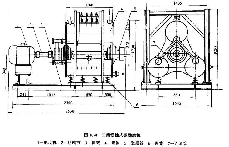 三筒慣性式振動磨機的構(gòu)造如圖10-4所示。它由電機1、聯(lián)軸節(jié)2、機架3、筒體4、激振器5、彈簧6相連通管7等部分組成。振動磨機的筒體由三個圓筒和兩塊側(cè)板構(gòu)成,通過兩側(cè)板將較大的上圓筒φ400xl040和較小的兩個下圓筒φ320xl040串聯(lián)在一起,而兩個下圓筒彼此互成并聯(lián),各圓筒內(nèi)壁上均鈕有襯板,以防筒壁磨損。激振器主要由偏心軸、可調(diào)式偏心塊、鑄鋼軸承座、雙列調(diào)心滾子軸承和迷宮式密封環(huán)等組成。電機1通過彈性聯(lián)軸節(jié)2帶動激振器5的偏心軸及安裝在軸兩側(cè)的偏心塊旋轉(zhuǎn),產(chǎn)生離心力,從而使坐落在彈簧上的筒體產(chǎn)生高頻小幅振動。物料和水不斷地從上圓筒的給料口加入,物料在筒內(nèi)粉磨介質(zhì)的頻繁沖擊和研磨作用下被磨細,完成一段粉磨,而后經(jīng)過排料連通管分別流入下部兩個小圓筒內(nèi)進行第二段粉磨,粉磨好的合格產(chǎn)品從小圓筒的排料口排出。整個粉磨作業(yè)為連續(xù)作業(yè)。
